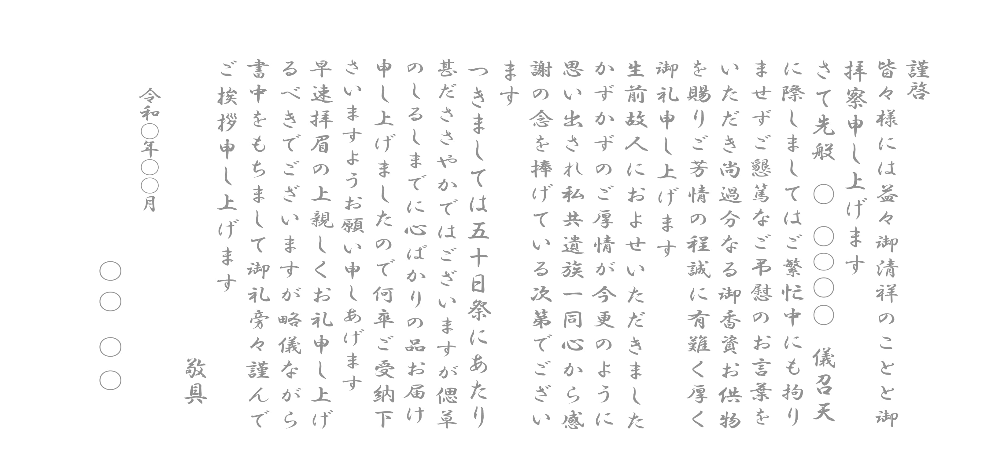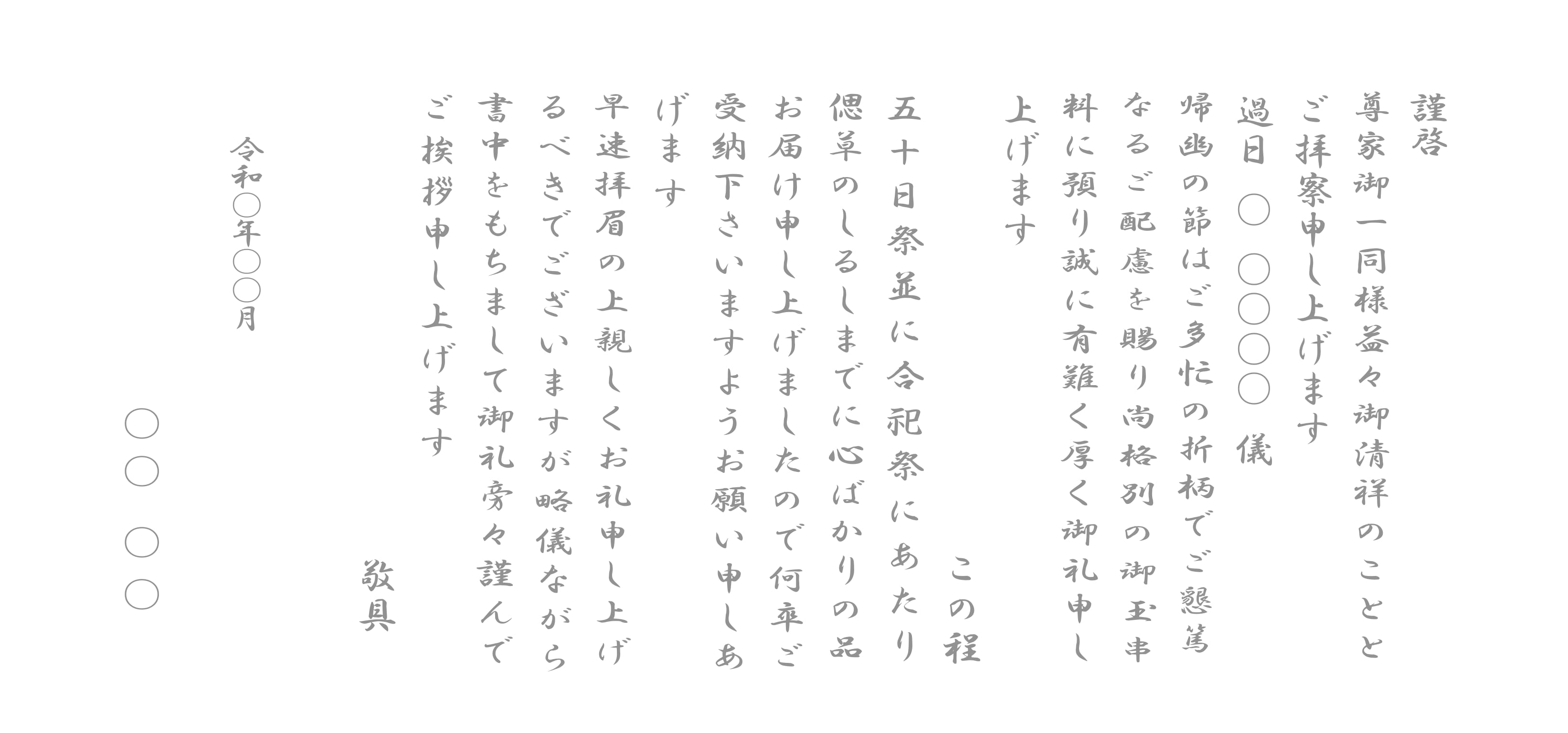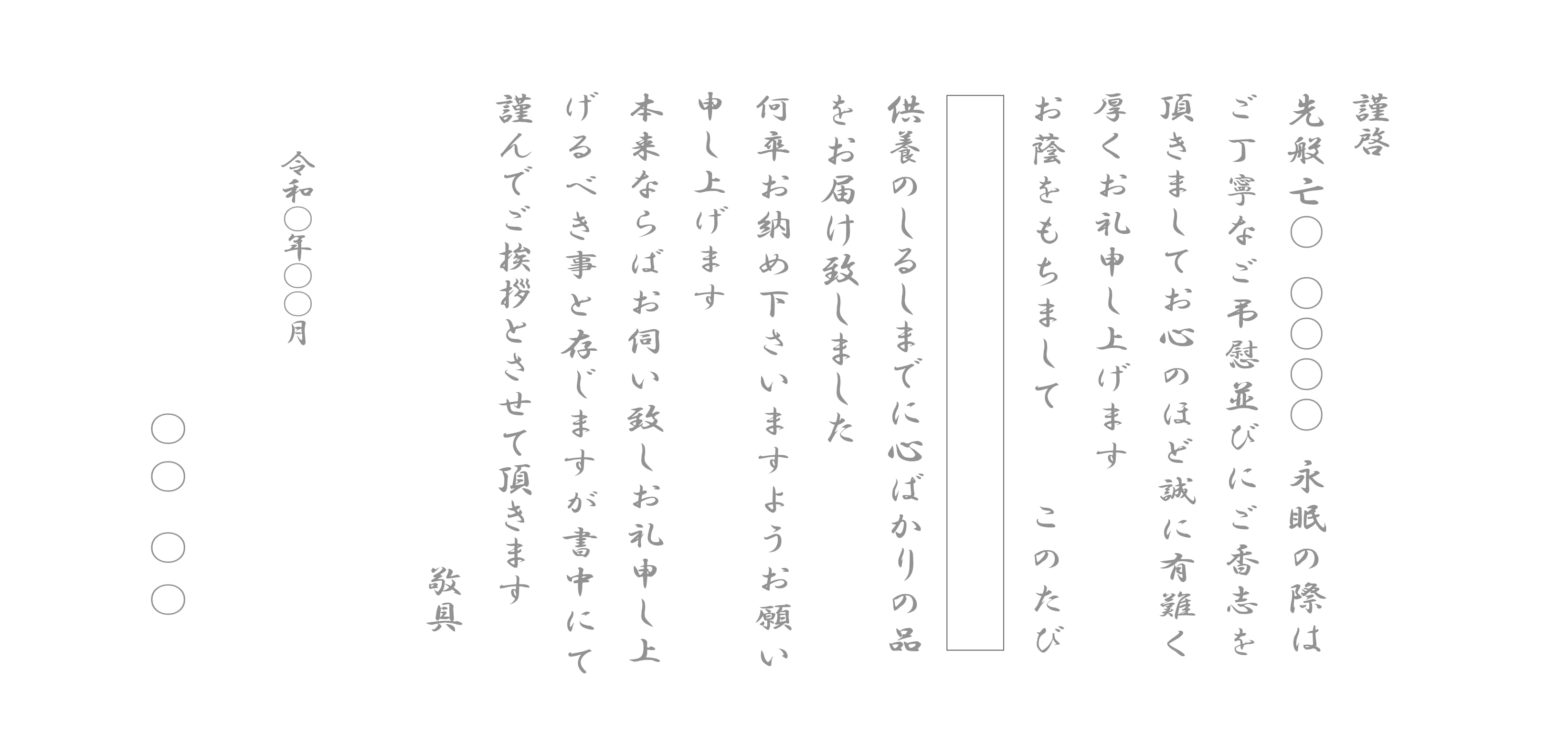ご挨拶状は、お香典を頂いた方々に対する葬儀の際のお礼と、法要を滞りなく営んだ(または営む)旨をお伝えする大切なものです。 つばさギフトでは、各宗派に合わせた挨拶文をご用意しております。